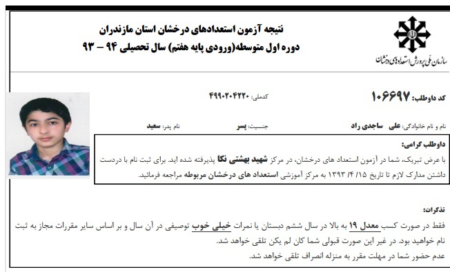 مدیریت مرکز علمی دکتر چمران و کادر علمی موفقیت آقای علی ساجدی راد در آزمون تیزهوشان را به ایشان و خانواده محترمشان تبریک عرض نموده و آرزوی موفقیت روزافزون برای ایشان را داریم.