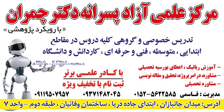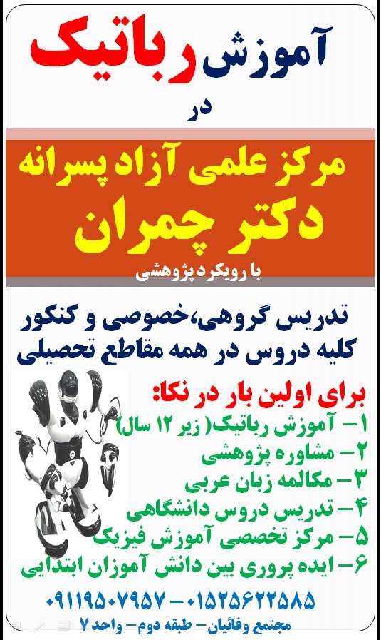روز اول نمایشگاه با حضور علاقمندان به رباتیک در مرکز نمایشگاه رباتیک مرکز علمی دکتر چمران شهرستان نکا برگزار گردید. هدف از برگزاری این نمایشگاه نشان دادن فعالیتهای آموزشی مرکز علمی دکتر چمران در زمینه آموزش ربات به دانش آموزان بوده است. در کنار آموزش رباتیک، آموزش مکعب روبیک، ایده پروری و شناسایی استعداد و پژوهش هم مورد توجه می باشند. در این نمایشگاه ربات های مسیر یاب پیشرفته و آنالوگ، ربات های نور یاب، ماشین حساب، ماشین کنترلی با سیم و بی سیم و ... به نمایش گذاشته شدند که مورد توجه علاقمندان قرار گرفت. این ربات ها ساخت دانش آموزان رباتیک مرکز علمی دکتر چمران شهرستان نکا بوده است. در این نمایشگاه آقای سجاد عبداله زاده به عنوان استاد رباتیک و آقایان میلاد نظری و علی شاملی از دانش آموزان برتر رشته رباتیک مرکز علمی دکتر چمران همراه ما بودند.